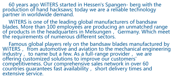 德國WiTERS帶鋸條適合不同行業使用,從鋼鐵生產、機械制造或汽車工業,如:切割各種不銹鋼、普通鋼材、有色金屬、高硬度材料、大直徑實心材料、鈦合金、鎳合金、銅合金、模具鋼、鑄件、整捆和單捆材料、管材等。歡迎洽淡合作!